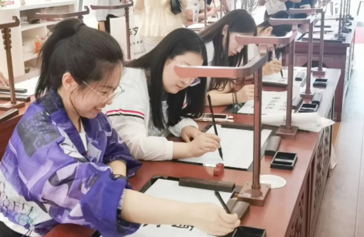 展會現場迎來了一群可愛的小學生,在華文眾合智慧書法教室中上了一堂科技感十足的書法課