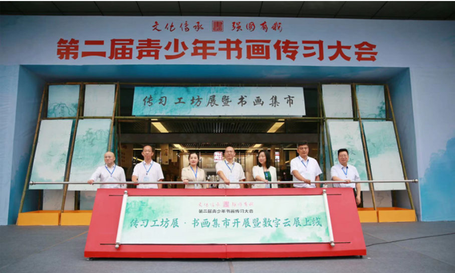 8月24日上午,第二屆青少年書畫傳習(xí)大會六大主題活動之一的傳習(xí)工坊展暨書畫集市開展儀式和青少年書畫傳習(xí)大會數(shù)字云展廳上線儀式在內(nèi)江國際會展中心舉行。