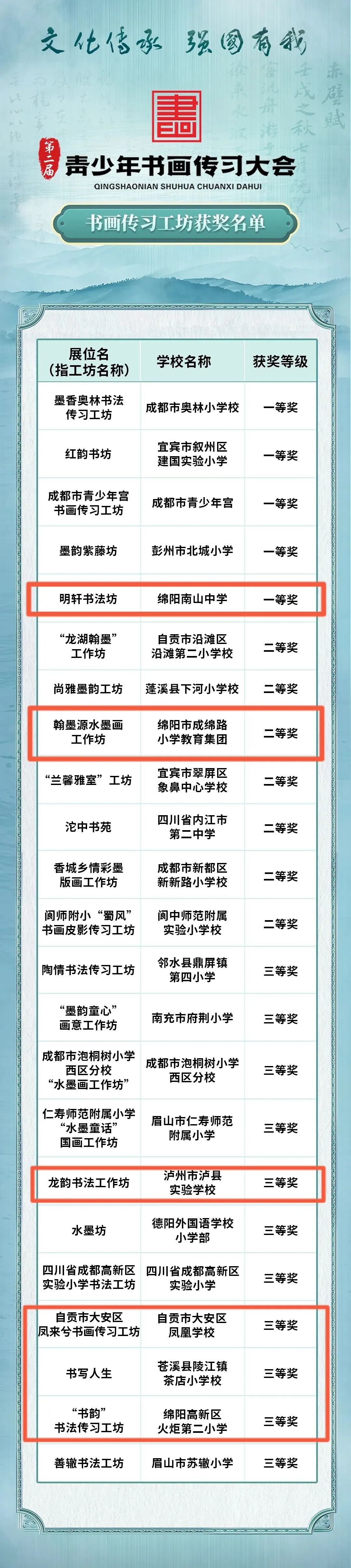 經(jīng)過激烈的比賽和緊鑼密鼓、嚴(yán)謹(jǐn)公正的評審,第二屆青少年書畫傳習(xí)大會全省決賽獲獎名單公布!其中書畫傳習(xí)工坊獲獎名單中,華文眾合眾多案例校榜上有名!