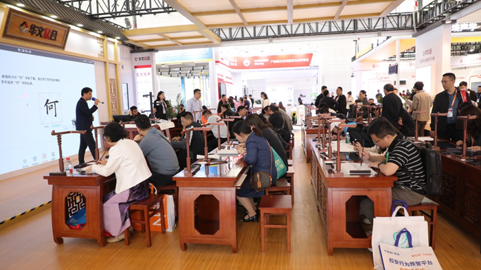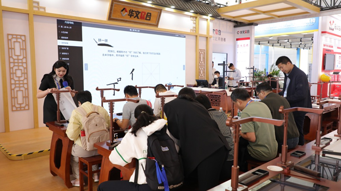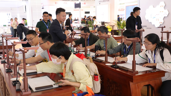 觀眾對華文眾合智慧書法充滿好奇與熱情,紛紛前來體驗。現(xiàn)場書寫,AI 即時生成專業(yè)測評,感受智慧書法教學(xué)的魅力。