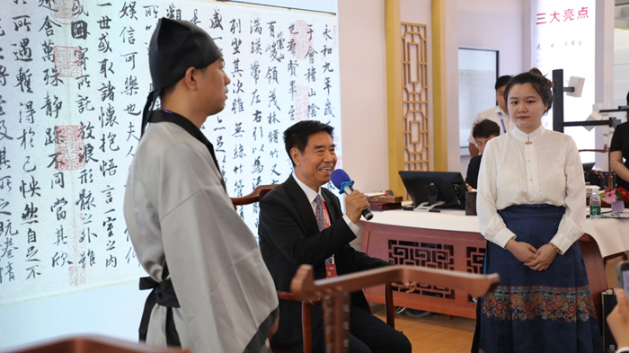教育部關(guān)心下一代工作委員會常務(wù)副主任王富現(xiàn)場背誦《蘭亭序》全文,觀眾云集,掌聲雷動,將展會氛圍推向高潮。