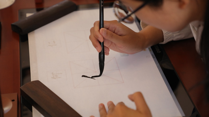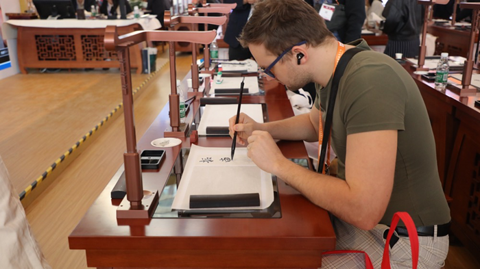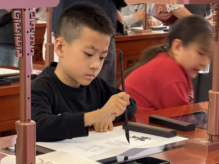 小朋友和外國友人也被吸引過來體驗智慧書法,傳統(tǒng)文化的種子不僅在孩子們心中悄悄萌芽,也通過外國友人散播到世界各地。
