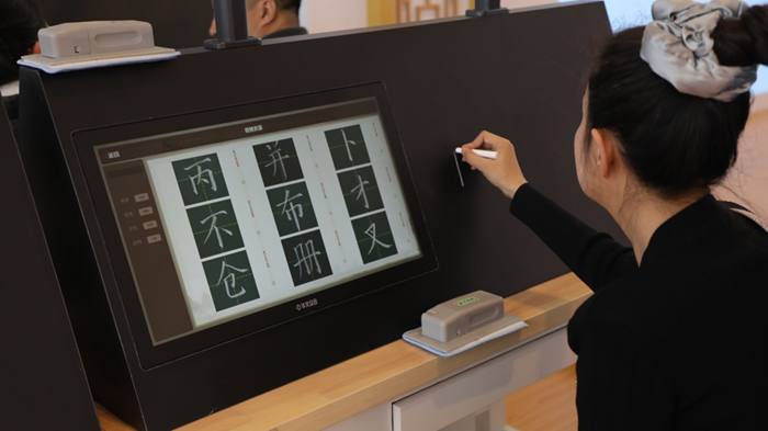 不少觀眾沉浸式體驗智慧粉筆臨摹臺。