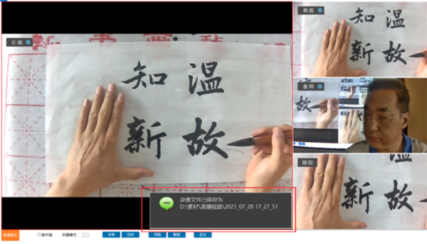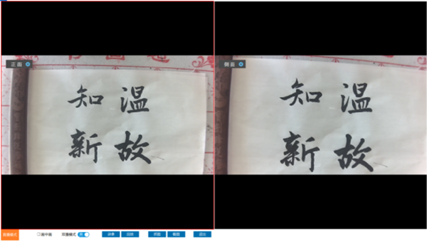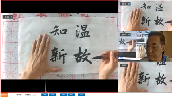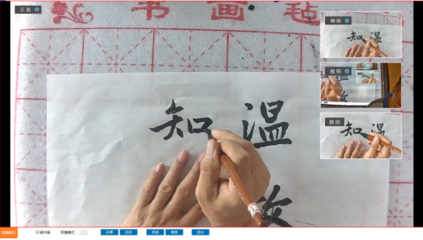 書畫教學展示臺由3臺攝相機組成,正面和側面攝像頭分別從正上方、左上方對書寫過程進行拍攝,特寫攝像頭正前方對教師授課進行怕拍攝,支持手動調焦。