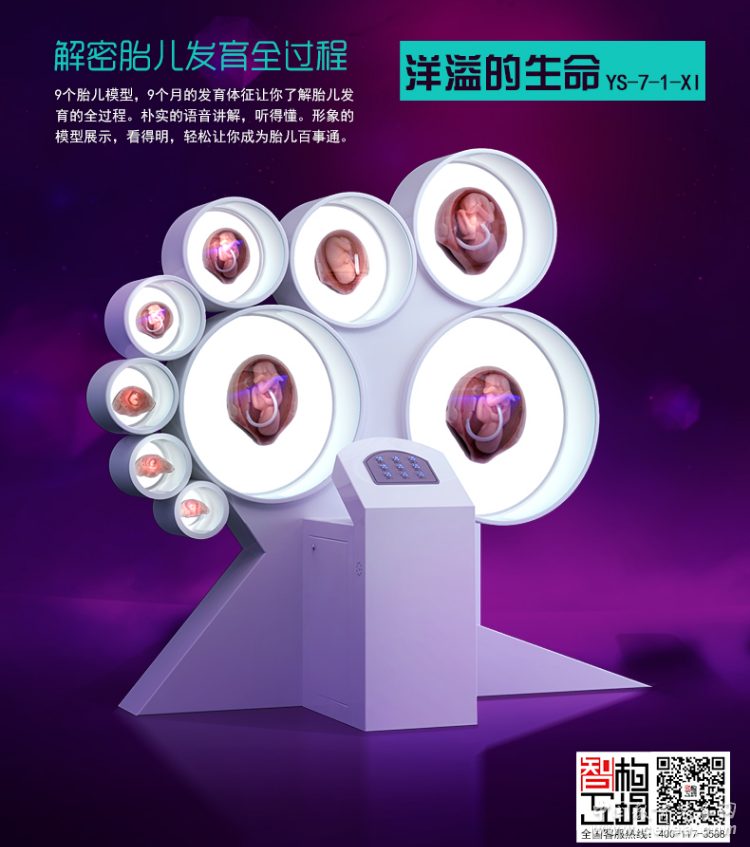 結合模型和語音講解系統展示和介紹胎兒發展的全歷程,該產品包括九個不同時期的胎兒模型以及相對應的語音講解內容,當體驗者任意按下某一個操作臺上的九宮格按鈕,對應月份的胎兒模型就會亮燈顯示,同時語音播報體長、重量及器官發育等信息。