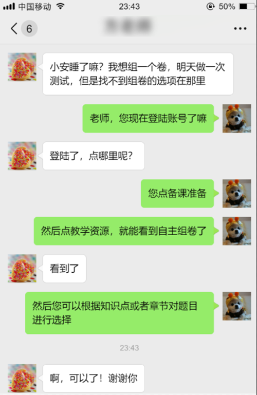剛開始在線教學的那幾天,有青鹿的工作人員全程“保駕護航”。有一次批作業到了半夜十一點多,想布置明天的測試但是突然忘記資源庫里的題要怎么組卷,就發微信問青鹿工作人員,沒想到她還是很快響應,耐心地教我怎么用,能夠順利度過這段適應期真的很感謝青鹿工作人員的積極配合。