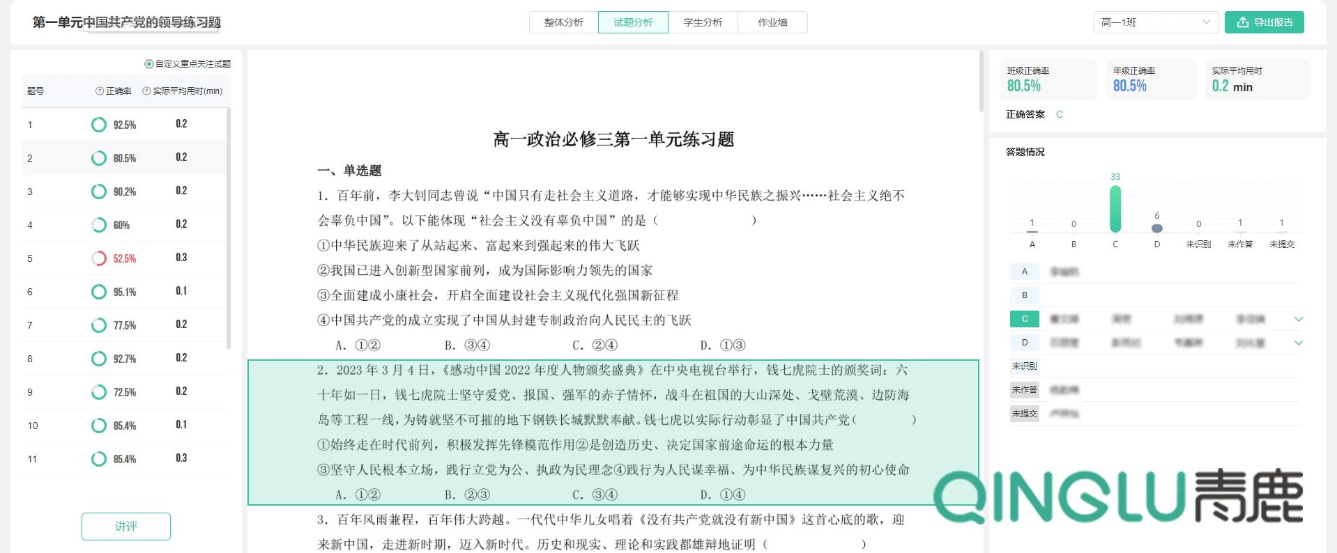 在課堂上,老師首先對第一單元的知識進(jìn)行梳理,并使用作業(yè)講評功能,對學(xué)生們課前的單元小測結(jié)果進(jìn)行精準(zhǔn)點(diǎn)評。