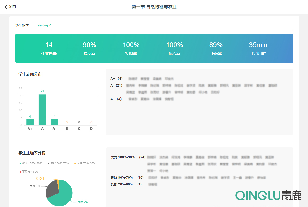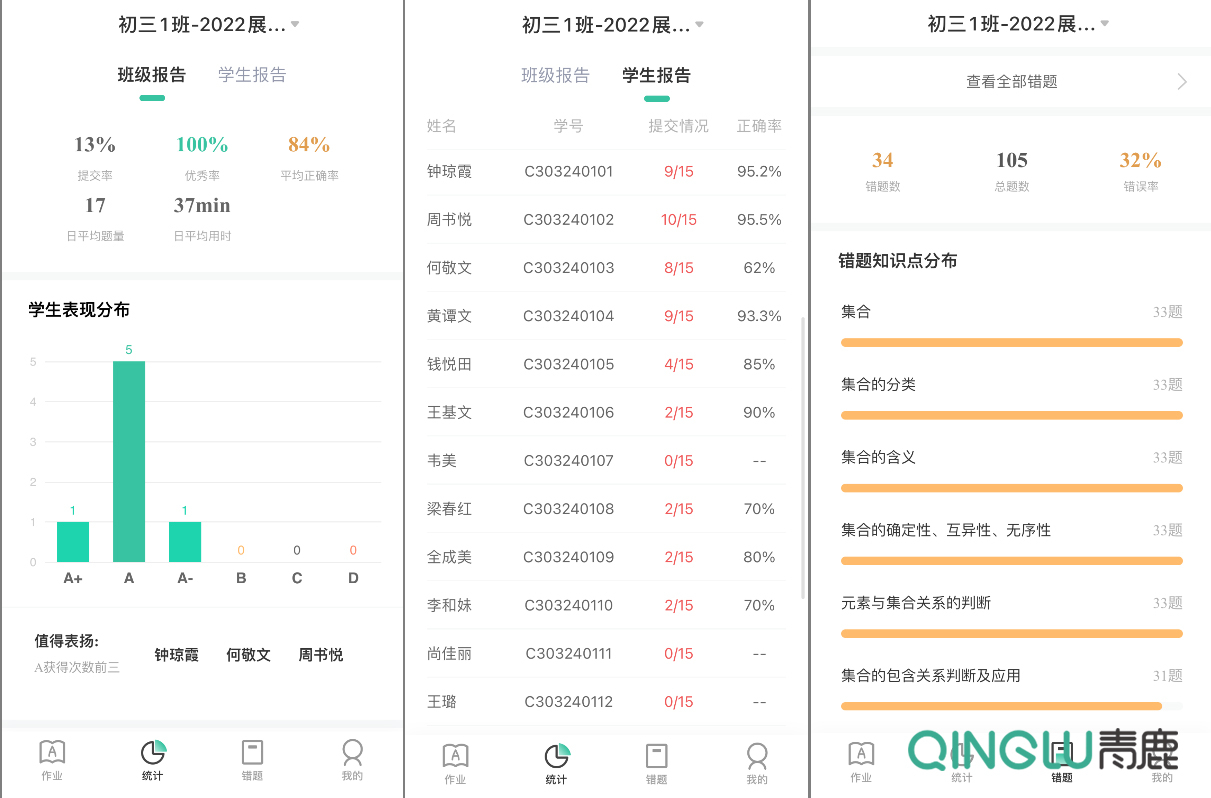 青鹿智慧作業(yè)能夠自動生成多維度的作業(yè)數(shù)據(jù)分析報告,精準(zhǔn)反饋面向?qū)W生個體、班級、年級、學(xué)科等不同層次的典型作業(yè)特征,為教師打造高質(zhì)量“課前—課中—課后”教學(xué)閉環(huán)提供數(shù)據(jù)決策支持。