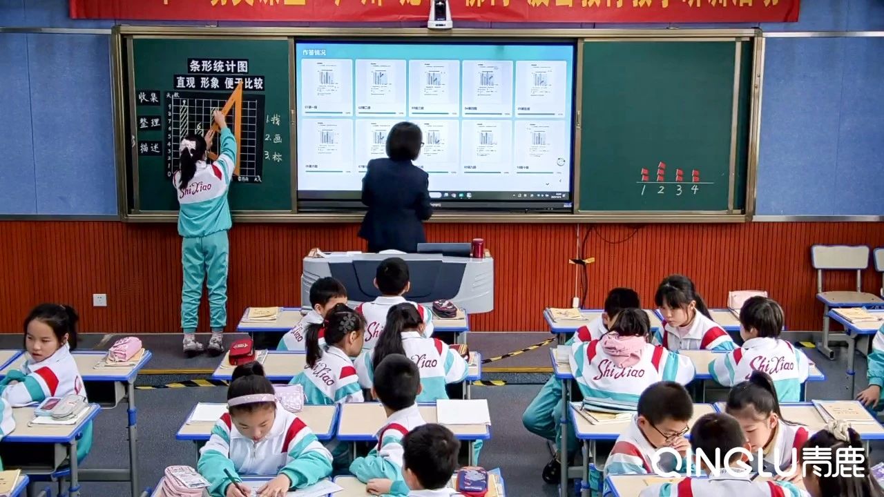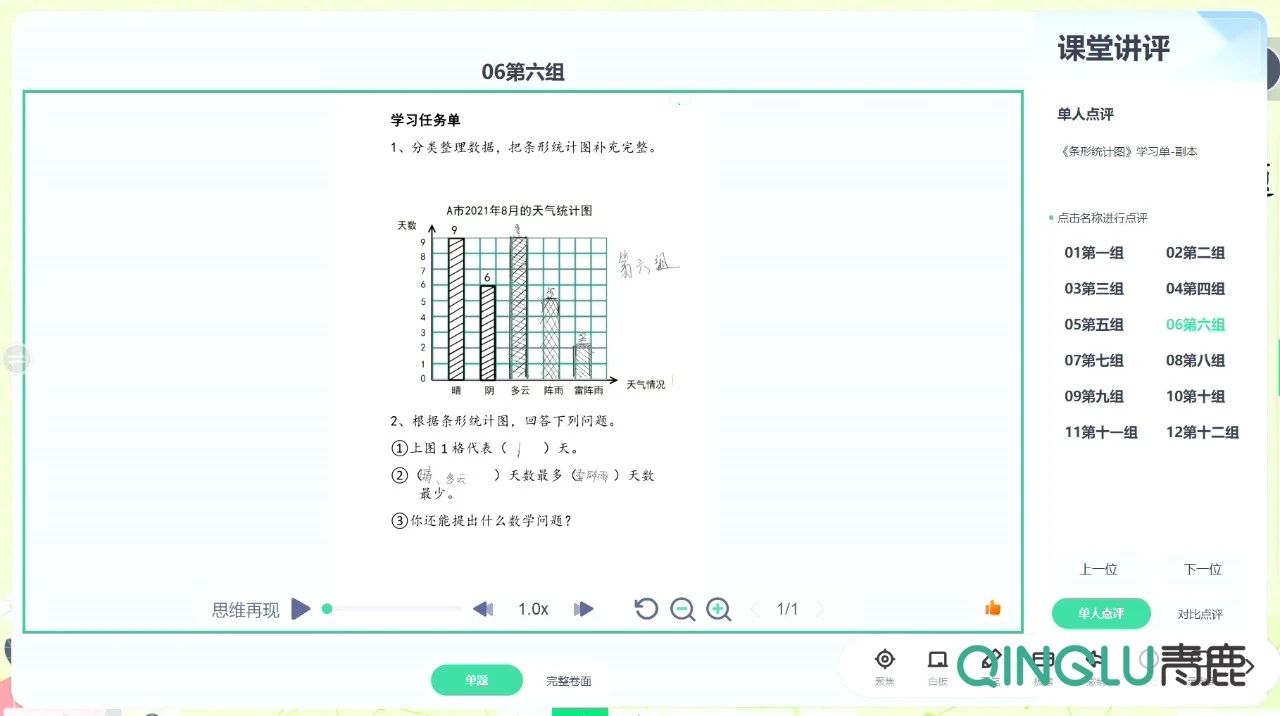 學生小組通過使用青鹿智能筆書寫探究成果,系統(tǒng)將實時傳輸書寫內(nèi)容至一體機大屏;教師可以即時查看學生完成的情況,并更快速、精準地對作答情況進行講解分析,鞏固學生對條形統(tǒng)計圖課新學知識的理解。