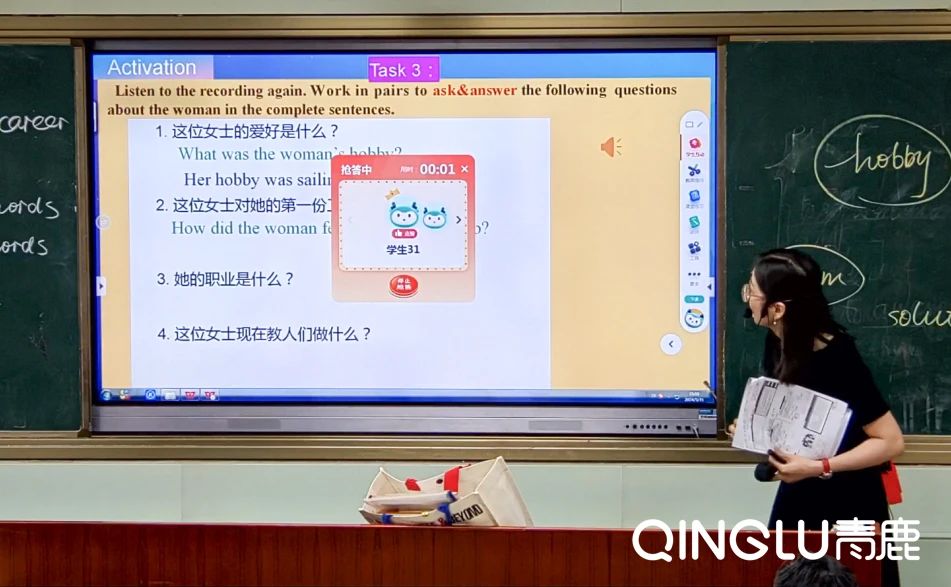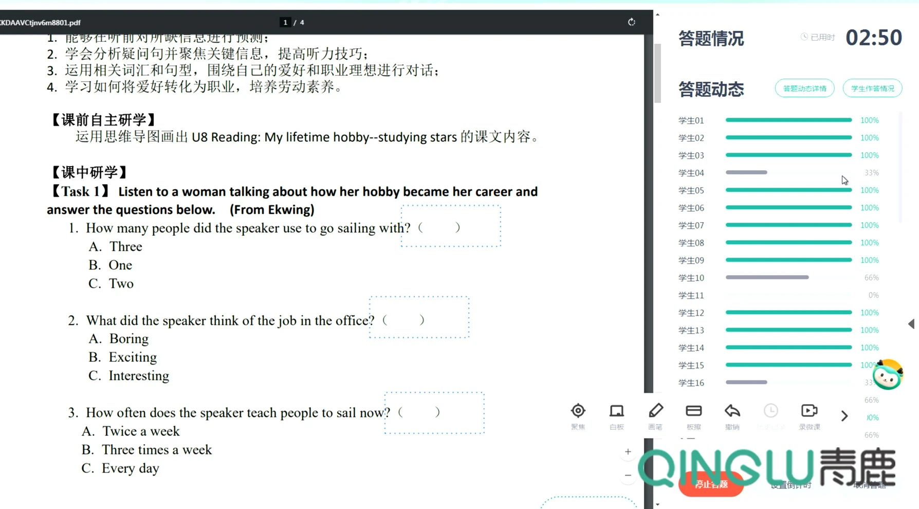 課中,老師在完成課程知識講授后,通過青鹿智慧紙筆系統(tǒng),布置選擇題聽力任務(wù)等練習(xí),及時(shí)了解學(xué)生掌握情況的效果,鞏固學(xué)生對所學(xué)知識的理解。