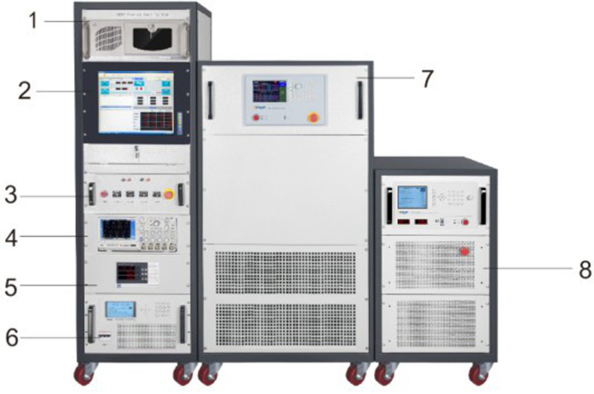 光伏逆變器自動測試系統組成部分:1. 工業計算機主機2.顯示器3. 系統控制單元4.數字示波 5.功率分析儀6. 光伏整列模擬器7.防孤島測試負載8.回饋式電網模擬器 測試示意圖: