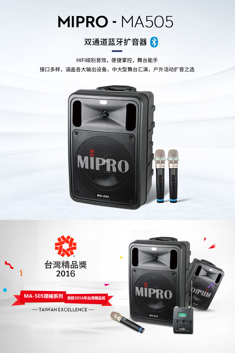 產品詳細介紹主要特點: 1。MA-505是凝聚MA-系列設計的精華,全面升級的先進機種。 2。以輸出145W高傳真、高效率的D類放大器驅動雙音路喇叭系統。 3。內建兩組具有Auto Scan及ACT功能的UHF PLL接收機,可另選購兩組擴充模 塊。 4。首創絕無折斷故障的高效率隱藏式主動天線,接收距離遠、不斷訊、抗干擾能力強。 5。可安裝選購的無線中繼發射器MT-91,擴展播音空間及傳輸距離。 6。內建研發的DPM-3數字式多功能錄、放音座,具有分離式操作面板的設計 7。可固定在面板上手動操作或取下作遠程遙控操作。 8。可選購CD/MP3播放模塊,擴充做背景音樂放音。 9。MP3播放器可直接刪除現場錄制或下載的歌曲。具有語言學習功能 “A→B"鍵, 可以選擇從A點至B點之間記憶及重播。 可同時使用有線、無線麥克風、CD及MP3等混合擴音及錄音,具VOP廣播優先 切換功能,當音樂播放中使用麥克風時,播放中的音樂自動淡出(Fade-out)靜音的 效果。 10. 可選配麥克風的ECHO回音功能。 11. 內建高效率的警報聲,當按下警報鈕后,立即淡入強勁的警報聲。 12. 高效率、高傳真的擴音電路,大音量不失真。 13. 內建交換式AC電源器,提供擴音機及電池快速充電的電源,可插接各國電壓不必切換, 內藏高容量鋰電池, 提供停電時全功能動作。 14. 4段電池容量LED燈顯示主機電池電量及充電狀況。 15. 具有腳架固定座可以安裝在三腳架上使用。 16. 內建收納盒,可以存放兩支手持話筒。 17. 應用在教學、集會、簡報、展覽會廣告及韻律舞等室內外機動性播音, 是取代傳統復 雜的擴音設備最簡便、最有效率的現代化擴音利器。 18. 臺灣設計、臺灣制造。 主要規格 放大器 D類放大,輸出**145W/ 4Ω,失真<1%,頻響50Hz~18kHz 靈敏度 正常:91dB,最大:109db 喇叭系統 1寸高音,8寸中低音紙盆式的雙音路系統 音源輸入 有線麥克風:XLR平衡式及6.3 Ø不平衡式輸入插座 無線麥克風 固定2頻道(選購2頻道) 放音座 DPM-3 LINE訊號 3.5 Ø不平衡式插座 藍牙功能 有 音源輸出 3.5 Ø不平衡式插座 外接喇叭 6.3 Ø輸出插座 音量控制 各種輸入音量獨立控制 特殊功能 VOP廣播優先,麥克風迴音 警報器 具有淡入功能的高效率警報聲 收納盒 可收納電源線 攜帶及架設 用手把手提,有腳架座可架設在三腳架上 電源 AC電源:內建100~240V AC交換式電源兼充電器 DC及電池:外加DC電源插座。內建25V/4.5A鋰電池 充放電時間 充電4小時,連續待機8小時以上 電池容量顯示 4段電池容量LED燈,顯示電池容量及充電狀況 尺寸 275(寬) *400(高)*225(深) 重量 約8.5kg (含AC電源及鋰電池) 載波頻段 480-934MHz UHF 頻寬及預設頻率 24MHz,16個互不干擾頻率 模組數 選購安裝1~2組MRM-70B 搭配發射器 無線ACT-32H / ACT-32T 中繼發射模組 MT-91(選購) 裝設方式 選配模組可快速抽換安裝 天線 首創高效率的主動隱藏式雙天線 認證及專利 具有新式樣專利,通過國內外電波法規及安規 備注 各項規格若有誤差,以實際產品為依據。 載波頻率范圍、高頻輸出功率及偏移度等依照各國電波法規各有不同規格。 |