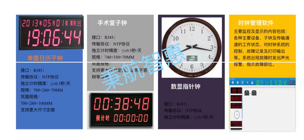 產品詳細介紹系統由GPS/北斗雙衛星時間信號接收天線、中心母鐘、時鐘管理計算機、NTP服務器、電源、子鐘、及通信線路等部分組成。 NTP服務器接收中心母鐘時間同步系統信號且能自動消除累計誤差。網絡數字子鐘、網絡輸出接口箱、管理計算機、時鐘網管監控系統、其它弱電系統均通過網絡獲取標準時間。 時鐘管理系統通過網絡與子鐘連接,實現時鐘系統的安全管理、告警管理、日志管理、故障管理、配置管理、狀態管理、遠程管理。能方便查看維護指南,在線幫助。設有設備維修檔案,記錄每個故障發生的具體位置、時間、類型、維修情況等。