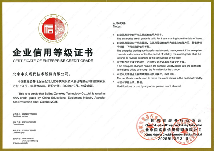 企業信用等級評價是衡量企業綜合信用水平的重要指標,其中AAA評級,是行業內對企業經營狀況、財務信用、管理能力、社會聲譽及履約能力等多個維度進行全面、嚴格評估后授予的最高榮譽。現代中慶連續維持AAA評級,不僅是公司多年來穩健經營、誠信為本的有力證明,更是對公司在教育裝備領域持續創新、優質服務的肯定。