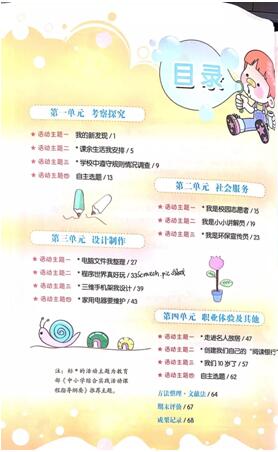 這本手冊主要包括“考察探究”、“社會服務”、“設計制作”、“職業體驗與其他”四個單元。每個單元有三至四個推薦的主題活動,有些單元還設置自主選題活動。在使用手冊的過程中,你可以根據自己的興趣或者老師的安排,打亂順序,選擇其中幾個感興趣的主題靈活開展活動,也可以圍繞你在生活中發現的問題,擬定主題開展活動。