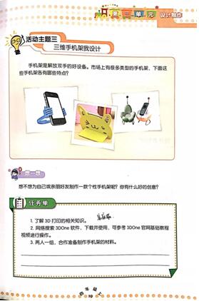 其中第三單元“設計制作”的活動主題“三維手機架我設計”中詳細介紹了如何使用3D One制作一款個性手機架,開闊思維,提高了同學們的動手操作能力。