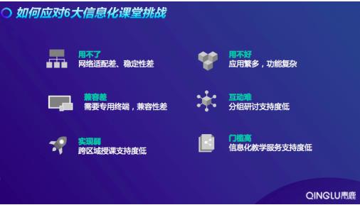 青鹿總結,“用不了、用不好、兼容差、互動難、實現(xiàn)弱、門檻高”成為當前課堂實踐中的6大痛點。