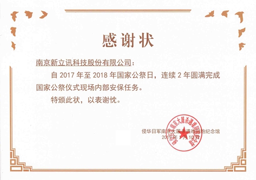 近日,南京新立訊科技股份有限公司收到侵華日軍南京大屠殺遇難同胞紀(jì)念館感謝狀,對(duì)新立訊在2017至2018連續(xù)兩年圓滿完成國(guó)家公祭儀式現(xiàn)場(chǎng)內(nèi)部安保任務(wù)表示感謝。