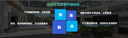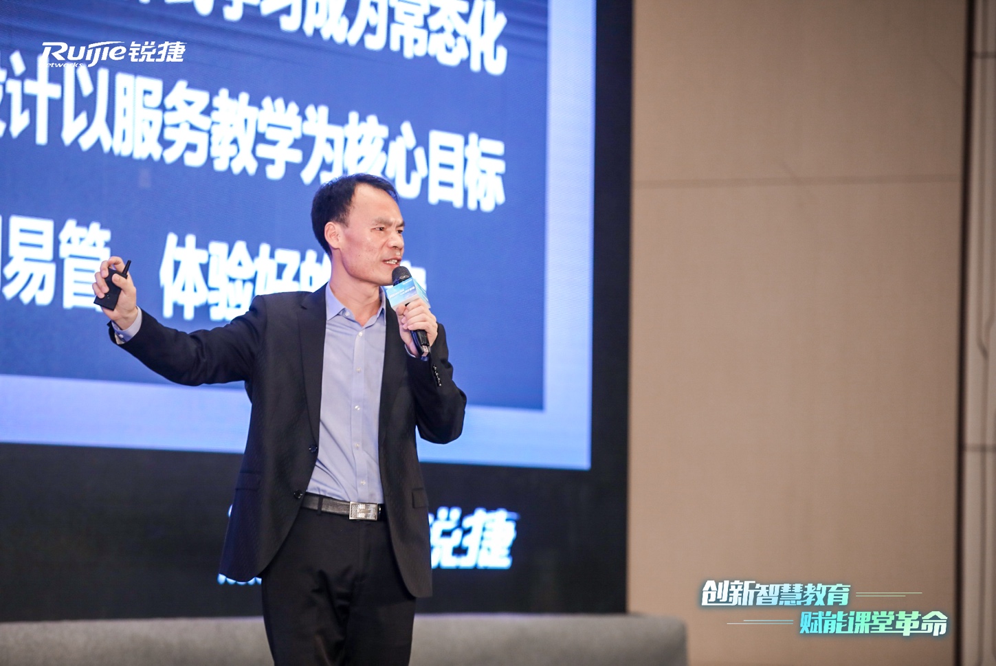 他談到,近年來,銳捷一直堅持“扎根行業、深入場景”的理念,基于教育行業客戶需求和應用特點進行產品創新!昂、易、融、合”不僅是這一理念的充分體現,同時也代表了新一代智慧教室的建設思想。