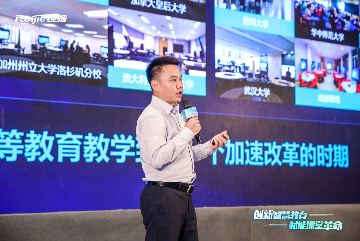 在智慧教室解決方案介紹中,銳捷網絡智慧教室事業部總經理蒙亮表示,這套方案得到了成都師范學院等一批高校用戶的實踐認可,用完整的IT環境、全場景的教學應用、全方位的空間設計、專業化的教學服務,滿足了高教用戶的核心需求。通過“簡、易、融、合”的設計理念,助力教學模式創新。