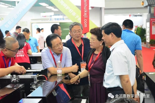 福建省教育廳廳長(zhǎng)和教育裝備何處長(zhǎng)及李光榮秘書(shū)長(zhǎng),廳長(zhǎng)贊揚(yáng)金三惠產(chǎn)品助力農(nóng)村音樂(lè)教學(xué)的實(shí)用性。