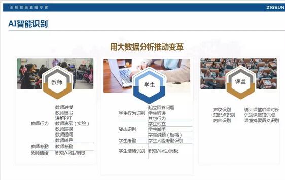 紫旭AI課堂以人臉識別、表情識別、教學行為分析為基礎,從課堂、教師、學生三個維度進行大數據分析,讓學校領導“有據可依”、“精準管理”,讓老師“因材施教”、“以導代教”,讓學生“主動思考”、“自主學習”,最終實現管、教、學方式的變革,促進學校教學管理模式的創新和教師教學水平的提升,幫助學生實現符合個性化成長規律的智慧發展。