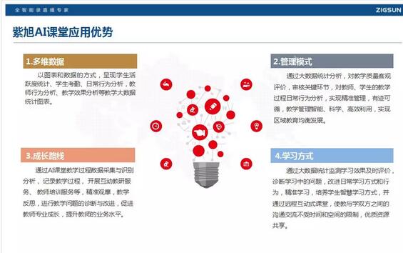 紫旭AI課堂以”人工智能助力教育,因材施教精準教學”為宗旨,圍繞學校教、學、管、評業務,采用過程化數據分析開展教學研究和學生綜合素質評價,實現教學評價從單一維度向綜合性多維度轉變,促進學校精準管理、教師精準教學、學生精準學習。
