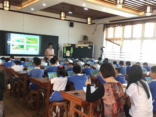 在新安中學外國語學校,來自二年級的英語老師曾珊娜和一年級的語文老師張斯琪分別帶了一堂別開生面的《a girl and three bears》和《棉花姑娘》課,淋漓盡致地展示了信息技術與課堂教學的高度融合。在英語課堂上,幾道英語隨堂測驗題完成后,優秀率、答題情況等,即時出現在老師屏幕上,曾老師對學生的知識掌握情況一目了然,明確學生問題較多的地方,進而確定課堂的重難點,切實做到了因材施教。在另一堂語文課上,學生在平板上獨自完成練習,張老師即時展示學生的作答情況,其余學生通過投票形式給學生點贊,通過系統的點名功能和投票功能,增強了師生互動性,提升了班級小組之間的競爭氛圍。課后,現場老師們也紛紛對這種新型的教育信息化智慧課堂給予了充分認可。