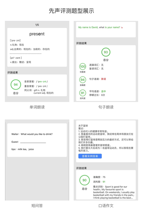 先聲智能語音測評系統在滿足對話和測評的基礎上,做到了全題型覆蓋、多維度反饋、實時測評、測評精確至音素級別,并滿足老師、學生、家長全終端無障礙使用。