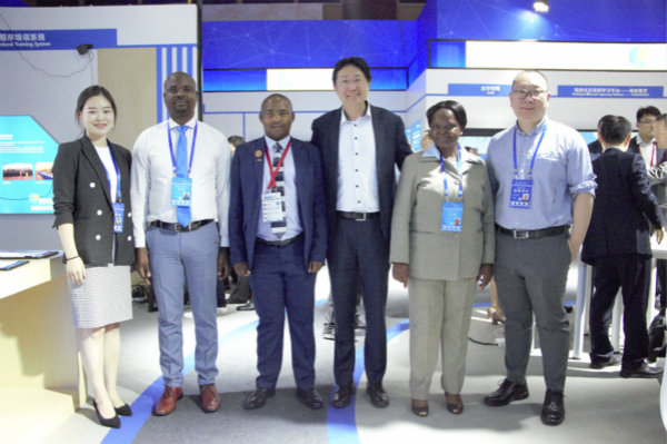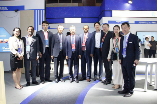 圖:埃塞俄比亞教育部部長一行及聯(lián)合國教科文組織領(lǐng)導(dǎo)參觀偉東云教育展區(qū)并合影