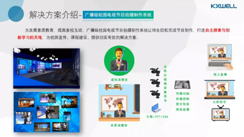 為發(fā)展素質(zhì)教育,提高家校互動,廣播級校園電視節(jié)目拍攝制作系統(tǒng)讓師生輕松完成節(jié)目制作,打造自主探索與創(chuàng)新學習的天地,為校園宣傳、課程建設(shè)、提供切實有效的解決方案。應(yīng)用于校園原創(chuàng)節(jié)目制作、校園自媒體、精品教學錄課、創(chuàng)客、微課、慕課制作等。