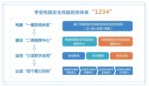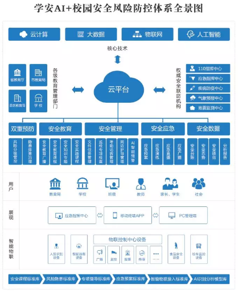 學安 —“AI+”校園安全風險防控體系應用云計算、大數據、物聯網和人工智能等先進技術,以雙重預防機制為基礎,以事前預防、事發預警、事中應急和事后處理的安全閉環管理為設計理念,融人防、物防、技防于一體,通過校園安全云平臺和校端安全生態鏈產品建立起局校可視化聯動、共享的校園安全風險防控生態,鑄就“全域、全時、全程、全員”的360度安全防護體系,讓校園更陽光。