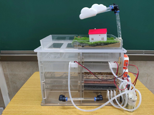 最終,學生們在老師的引導下,通過灌溉、蓄水、降溫等實驗,完成了基于圖形化編程的海綿城市除霾澆灌系統的研究,并設計出一個海綿城市系統。