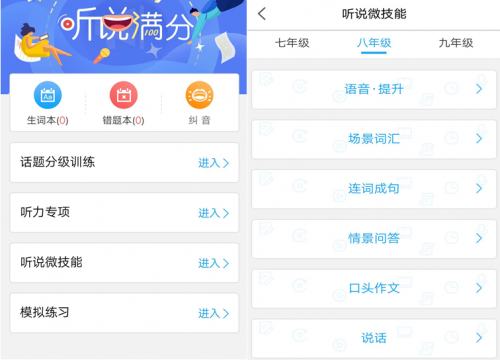 天學(xué)網(wǎng)英語聽說滿分(包括初中版和高中版),采用人機(jī)對話模式,即時(shí)反饋,讓你自信開口說英語。從發(fā)音糾正、情景對話、口頭作文、連詞成句等方面進(jìn)行針對性微技能訓(xùn)練,全面提升大家的英語聽說能力。