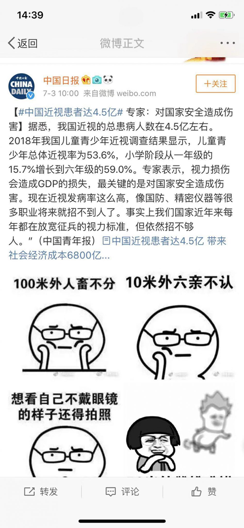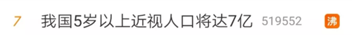 那份報告寫道:2012年我國5歲以上總人口中,各類遠視力缺陷的患病人數大約在5億,其中近視的總患病人數在4.5億左右。可以說,中國幾乎每3個人當中就有一個人患有近視。若沒有有效的政策干預,到2020年,我國5歲以上人口的近視患病率將增長到51%左右,患病人口將達7億。