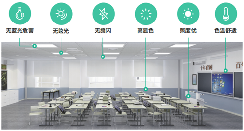 數言智慧光環境系統采用LED護眼教室燈,專業的光學設計,以達到全護眼6大核心指標;“9+2”或 “9+3”模式: 9個教室燈,2~3個黑板燈,配合不同教學場景,匹配不同亮度及色溫,預防近視,提高學習效率。