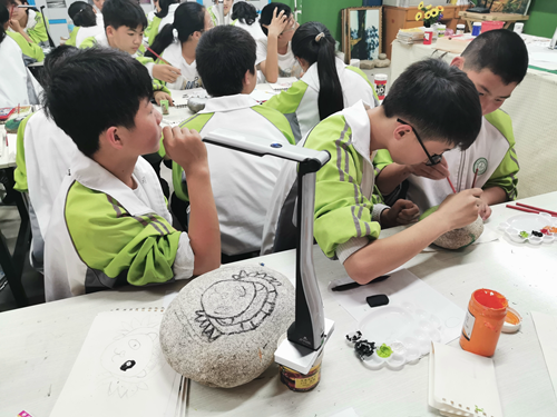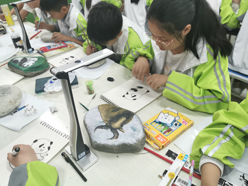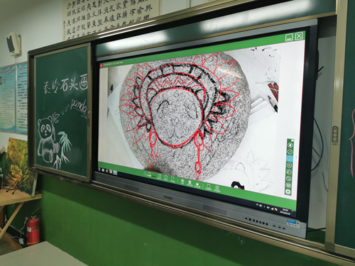 在熊貓石頭畫美術課上,師生們正在使用吉星捐贈的未來智慧美術全互動系統進行美術教學。