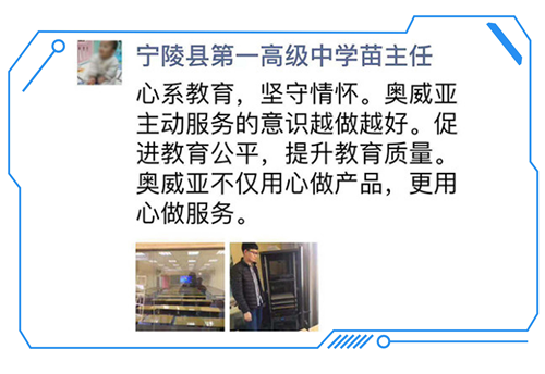 二、有了頂尖的技術和過硬的質量之后,再有周到的售后檢修服務,奧威亞的優質品牌形象便牢牢地立在了用戶心里。通過巡檢活動,更多用戶意識到了奧威亞設備應用的可靠性,基于對企業的信任,與奧威亞建立了更深度的合作關系,更主動向他人引薦。本次巡檢中,就憑借良好的服務口碑,與西北師范大學及甘肅多所中小學展開了合作。