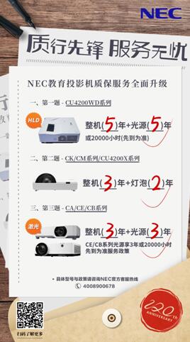 為了給用戶提供更完善的售后服務,免去用戶后顧之憂,2019年在產品技術升級、創新驅動下,NEC再次提升了教育市場的“售后維保”承諾,全面升級各系產品質保時長,刷新行業紀錄。