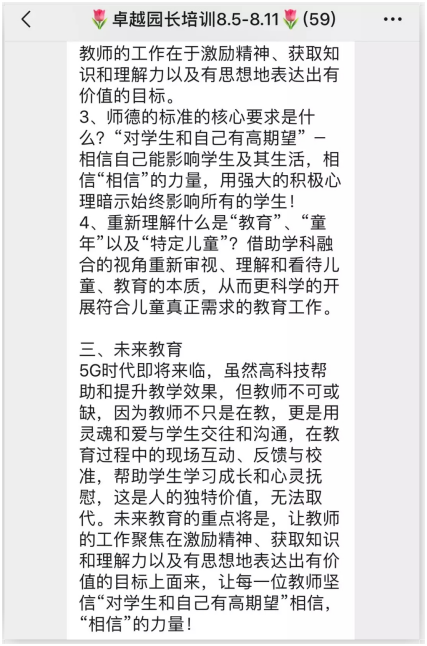 課后,學員們思緒難平,紛紛在微信群里熱烈討論著華東師范大學兩位教授的授課內容,討論主題圍繞著兩大方面進行展開。一是從宏觀上對政策進行解讀,就“新時代的特征與對教育的需求、教育發展系列新政策的重點與特點、新時代對辦園的政策要求與影響”進行研讀。