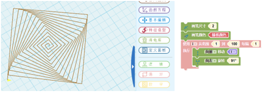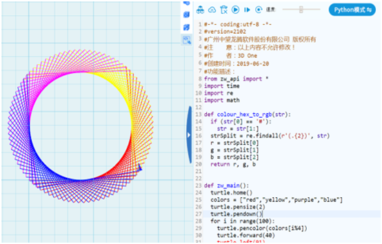 3D One軟件積木模式下,只需通過海龜庫控制畫筆的移動,并結(jié)合數(shù)學知識,簡單幾步操作,就能繪制出形狀和顏色都鮮艷豐富的圖案,單擊切換Python模式還可了解圖案代碼,為少兒入門學習Python提供更加輕松樂趣的途徑。