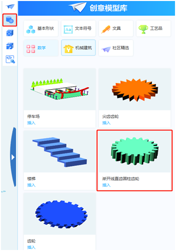 3D One V2.6版本創(chuàng)意模型庫新增漸開線直齒圓柱齒輪,一鍵生成適用于各種場景的不同大小齒輪,幫助老師同學輕松構(gòu)建各種聯(lián)動結(jié)構(gòu),堆疊出自己的創(chuàng)意模型。
