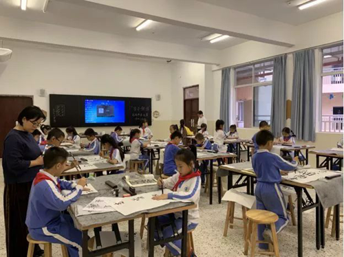 在松崗實驗學校在UCN智慧教室中,就有一場精彩的軟筆書法比賽。