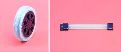用新型3D打印機(jī)打印的一個(gè)輪子(左圖)和一根柔性導(dǎo)電帶。