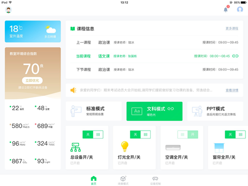 這些數據學校可以通過智慧環境中控系統微環境PAD端界面或者智慧環境中控系統微環境手機端界面查看,實時關注學生教室的各項環境指數。