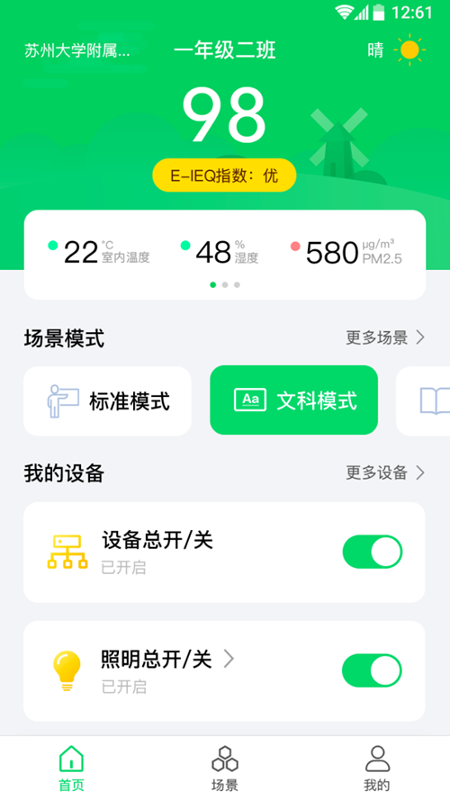 數言智慧環境教室可以通過超級傳感器感應監測教室內的亮度、溫濕度、PM2.5、PM10、CO₂、甲醛、TVOC等數據。