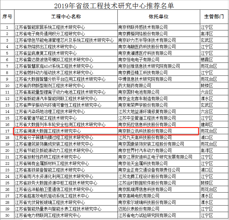 近期,經江蘇省科技廳組織評審,南京市科學技術局官網公示了2019年度省級企業工程技術研究中心及企業院士工作站推薦名單,新立訊獲授江蘇省溯源大數據工程技術研究中心(省級)。