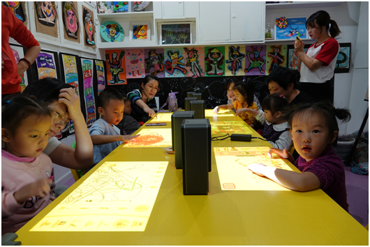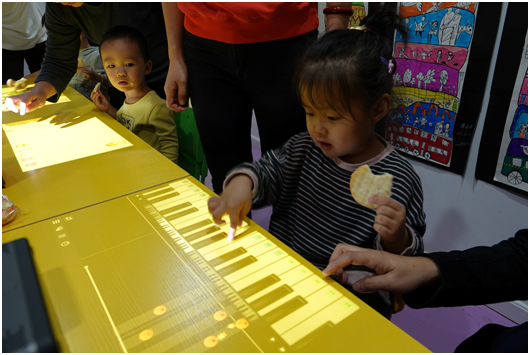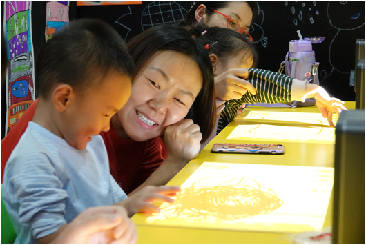 此次公開課分為宣講普及和自由體驗階段。宣講普及階段,哈奇智能的培訓師邀請了6個家庭以VIP私密小課的形式進行,孩子為3~6歲。除了介紹puppy cube光影魔屏的技術特性,以及兒童教育、親子陪伴方向的眾多應用,還引導孩子和家長現場進行親子互動繪畫比賽、AI智能樂感訓練。在家長和培訓師引導下,孩子們通過觸控屏上先后畫出了小豬佩奇以及各種稚氣十足的圖案,早教老師也指點孩子們成功演奏了知名兒歌《蟲兒飛》、現場不斷回蕩著孩子興奮的尖叫。