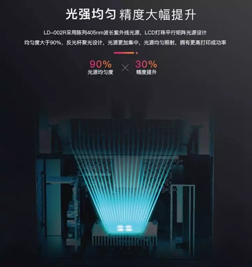 LD-002R采用陳列405nm波長紫外線光源,LCD燈珠平行矩陣光源設計,均勻度大于90%,反光杯聚光設計,光源更加集中,光源均勻照射,有效避免光不均勻和光源衰竭導致打印失敗,大大提高打印成功率。
