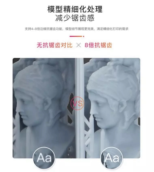 LD-002R系統支持4-8倍邊緣抗鋸齒功能,經過專門的算法處理,可精準地復原設計細節,有效減少邊緣鋸齒現象,滿足精細化打印需求,使模型細節更光滑細膩,有效降低了后處理的難度和時間。